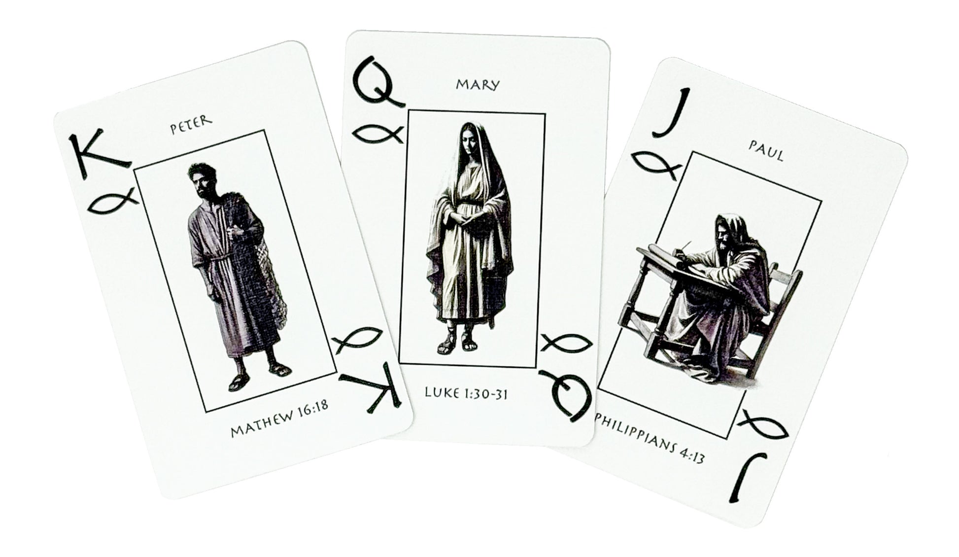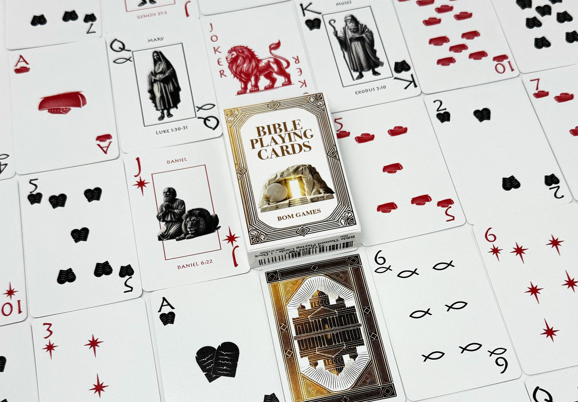 Discover a deck like no other. These Bible Playing Cards combine classic gameplay with rich Christian symbolism, featuring custom illustrations of iconic Bible characters like Moses, Ruth, Mary, and Daniel. Each suit is redesigned with faith-inspired symbols: Loaves, Fishes, Tablets, and Stars.